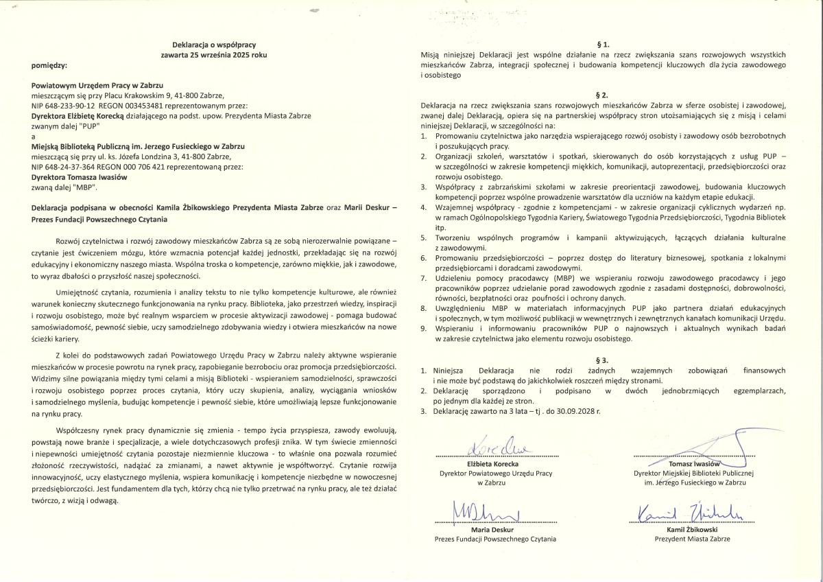 W ramach współpracy Miasto Zabrze, Prezydent Kamil Żbikowski, Fundacja Powszechnego Czytania, Powiatowy Urząd Pracy oraz MBP Zabrze połączyli siły, aby pokazać, że czytelnictwo i rozwój zawodowy mogą iść ze sobą w parze.